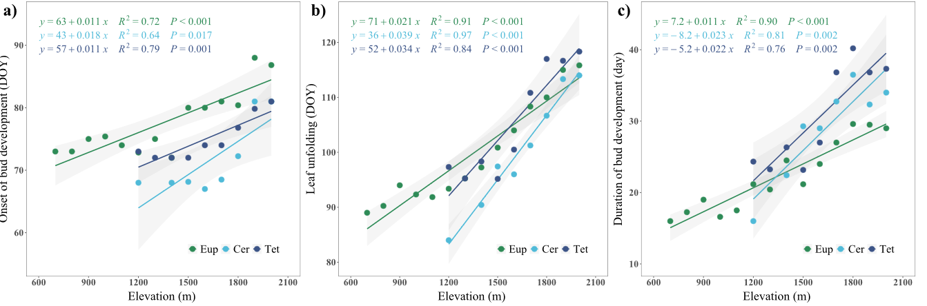 图 1神农架山地三种珍稀木本植物春季叶物候沿海拔梯度的变化格局。(a) 叶芽发育开始时间; (b) 展叶时间; (c) 叶芽发育持续时间。Eup, 领春木Euptelea pleiospermum; Cer, 连香树 Cercidiphyllum japonicum; Tet, 水青树Tetracentron sinense.