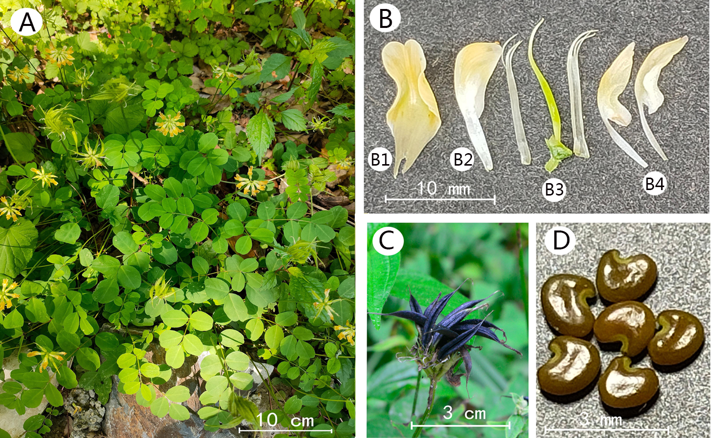 图1:A.巴山黄耆居群;B.花部解剖图,B1.旗瓣,B2.龙骨瓣,B3.雄蕊和雌蕊,B4. 翼瓣;C果实;D.种子。