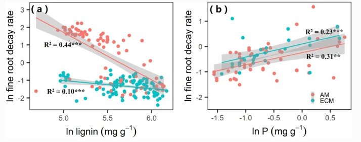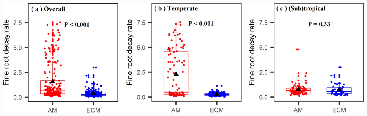 森林细根分解对于森林生态系统养分循环至关重要,而且不同树种会形成不同菌根类型arbuscular mycorrhizas (AM): 内生菌根,ectomycorrhizas (ECM): 外生菌根)这会造成不同菌根树种的细根化学特征存在差异,进而影响细根分解。然而,不同菌根类型对细根分解的影响是否会随着不同森林生态系统(热带/亚热带森林和温带森林)的改变而变化仍不清楚。