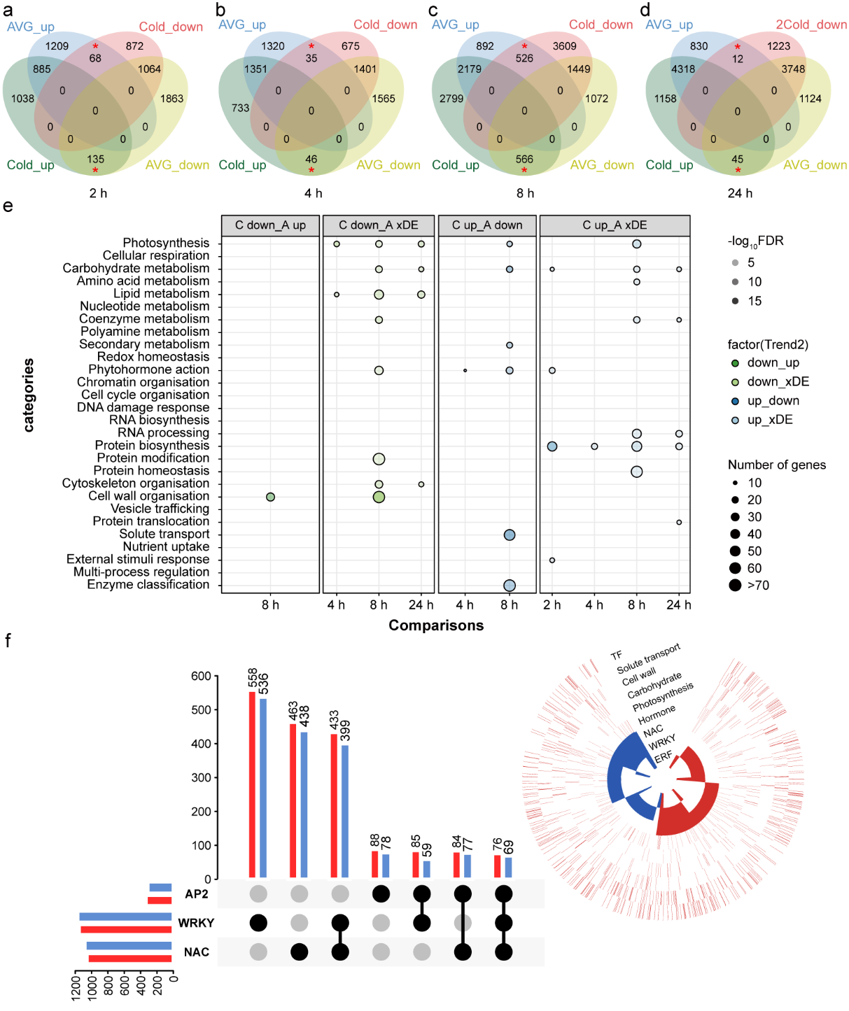 中国科学院武汉植物园联合澳大利亚国立大学生物研究院、中国科学院植物研究所、湖北省农科院、新疆农业科学院吐鲁番农业科学研究所多位科研人员,选取冬季极耐寒的野生葡萄品种山葡萄(V.amurensis)的叶片作为实验材料,研究了低温胁迫下葡萄叶片转录组和植物激素的变化,鉴定了在低温胁迫下ETH调控的基因,并讨论了ETH与其他低温诱导的植物激素之间可能的相互作用。结果表明,AP2/ERFWRKY转录因子(TF)是两个高度富集的TF家族,在低温胁迫下持续上调,但被AVG抑制。通过比较葡萄叶片在低温处理下和低温并外源喷施AVG处理下的转录组,可以鉴定潜在的ETH调控基因。受ETH正向调控的基因在溶质转运、蛋白质生物合成、植物激素作用、抗氧化和碳水化合物代谢等方面富集。在低温胁迫下,ETHIAAABA的合成和信号通路相关基因表达上调,而AVG则抑制这种上调。ETHABAIAA在低温下的含量变化与转录组数据一致,表明ABAIAA在低温胁迫下的响应可能是通过ETH信号通路调控的。