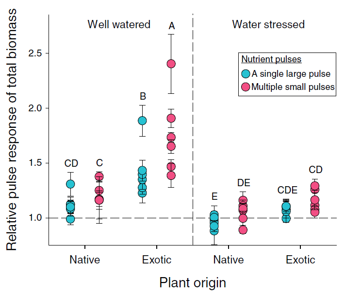 本研究得到了国家自然科学基金、湖北省自然科学基金和武汉市应用基础前沿计划等的支持。相关研究成果以Effects of nutrient pulses on exotic species shift from positive to neutral with decreasing water availability为题,在生态学期刊Ecological Applications上发表。