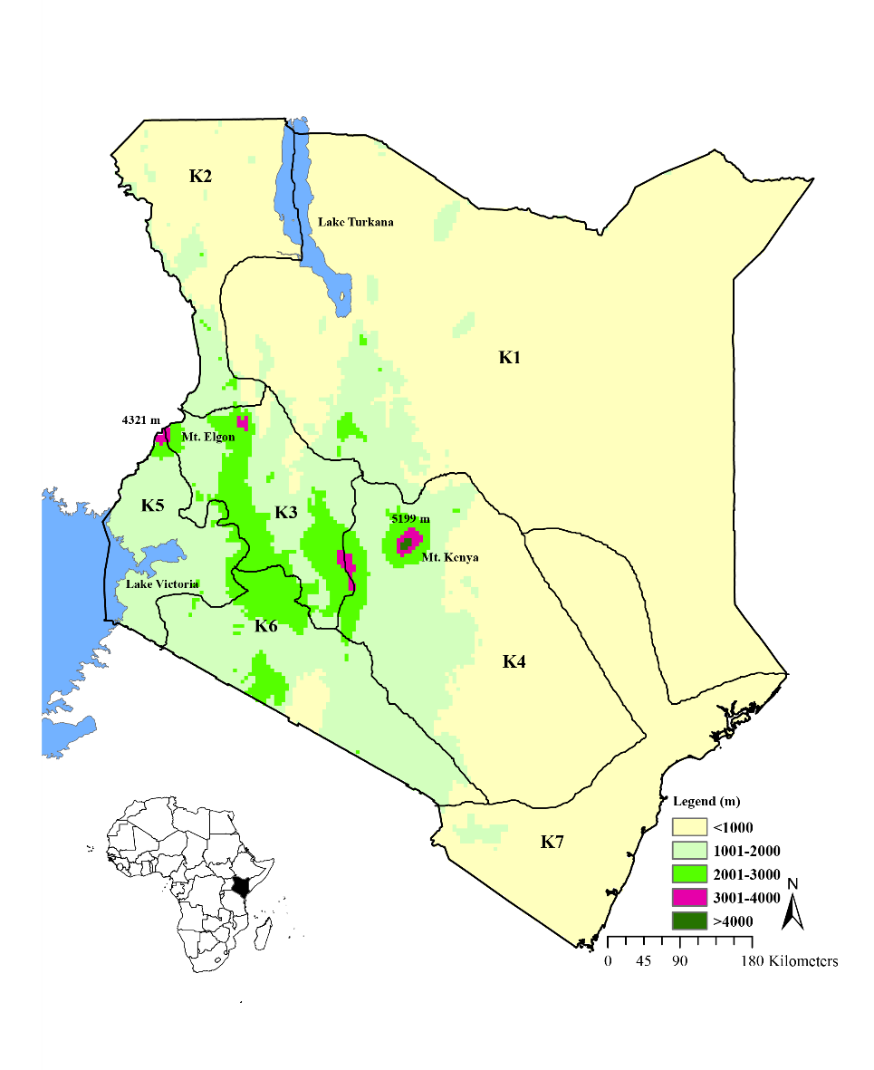 注:K1-K7表示肯尼亚的植物区系划分,参考于《Flora of Tropical East Africa》(FTEA,1952-2012)