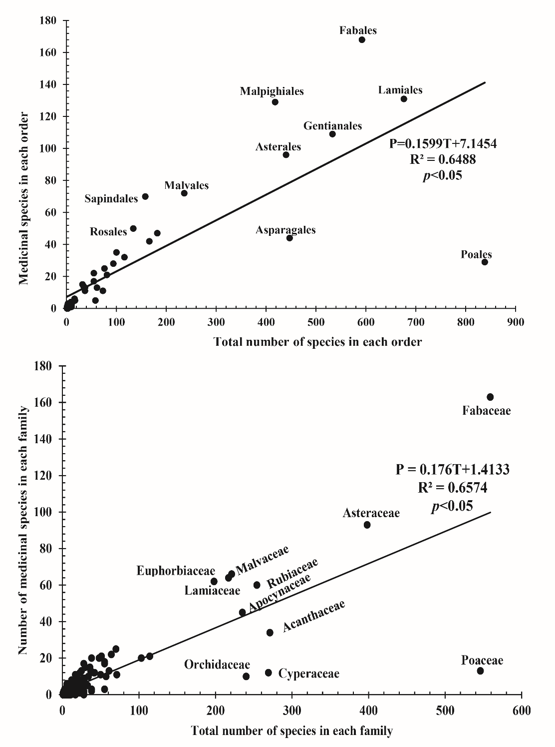 图2 线性回归模型显示药用植物的数量与各目和各科的物种总数之间的关系