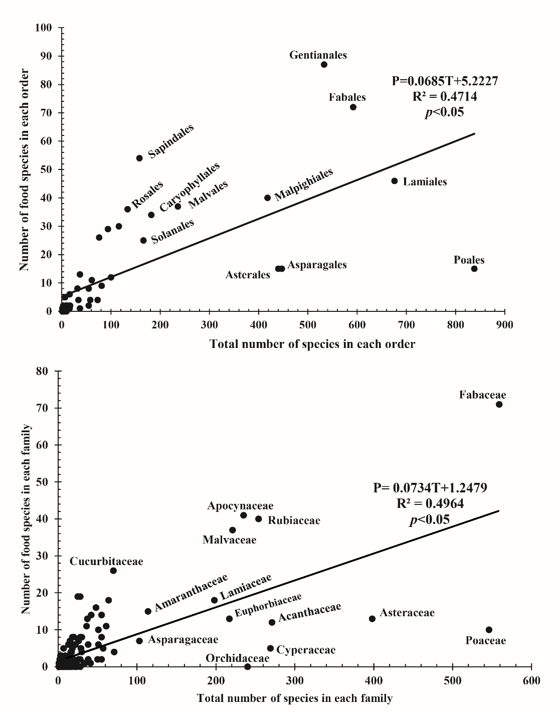 图3 线性回归模型显示食用植物的数量与各目和各科的物种总数之间的关系