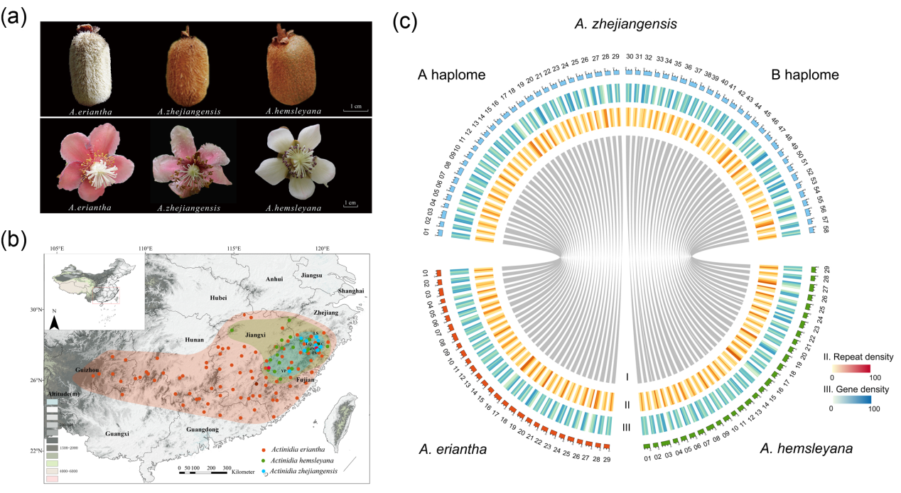 在物种进化过程中, 自然杂交在物种多样性的形成与维持中发挥着重要作用;然而同倍性杂交(homoploid hybridization)在物种形成中的作用仍然存在争议;相较于多倍体杂交物种形成,同倍性杂交物种形成案例非常少。同倍性杂交的进化后果是导致同倍性物种形成还只是进化过程的噪音或死胡同(dead-end hybridization)仍需要更多的案例研究。猕猴桃属植物存在着广泛的种间杂交,是研究植物杂交物种形成与多样化的良好材料。浙江猕猴桃(Actinidia zhejiangensis)是1982年发表的一个猕猴桃种,其主要分布在浙江、江西和福建,数量稀少。过去的研究认为浙江猕猴桃可能是由毛花猕猴桃(Actinidia eriantha)和长叶猕猴桃(Actinidia hemsleyana)或山梨猕猴桃(Actinidia rufa)种间杂交形成的种。由于基因组资源的缺乏,极大地限制了猕猴桃属植物同倍性杂交事件的鉴定以及进化后果的研究工作的开展。