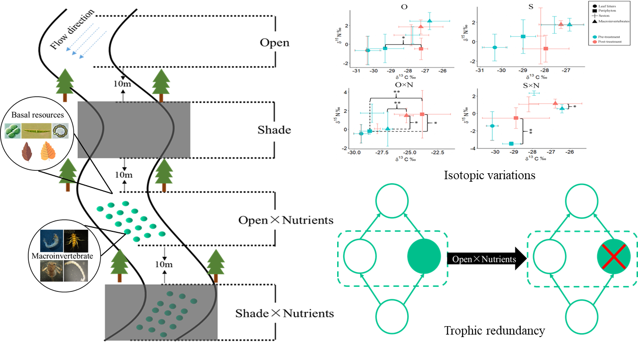 河流表面接收的光强和水体的营养负荷增加是河流生态系统中两个普遍存在的环境压力源,两者通过改变河流食物网中基础资源的可利用性,对河流食物网产生自下而上的影响。然而,二者的交互作用如何影响河流食物网结构及碳的来源的研究相对不足。