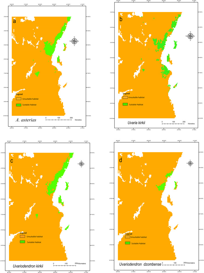 图1 目前预测的栖息地适宜性地图显示了四种番荔枝科植物在肯尼亚和坦桑尼亚海岸线的分布情况