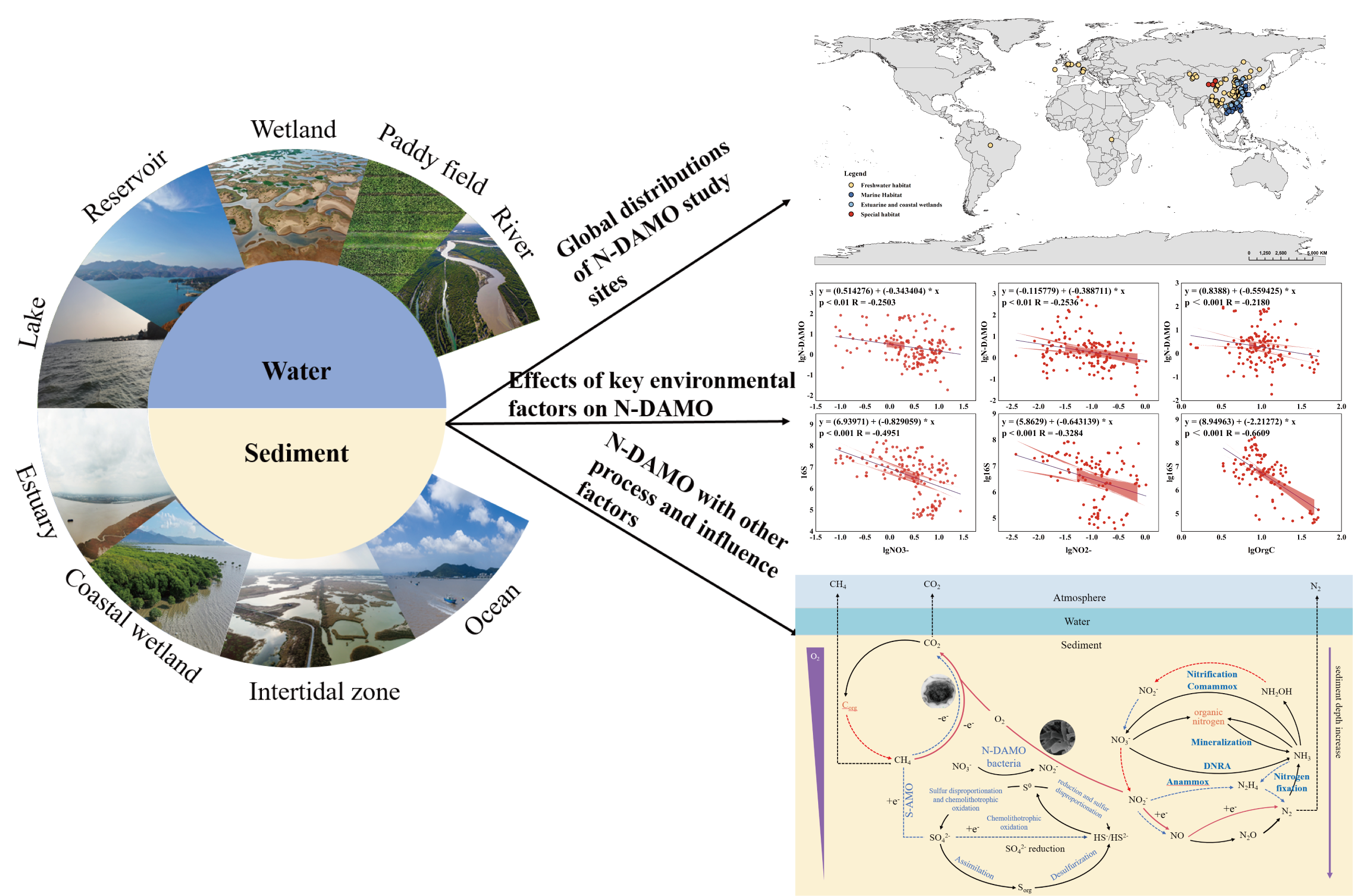 武汉植物园水生植物与水生态系统健康学科组硕士研究生张淼在邢伟研究员的指导下,系统综述了自然水环境中N-DAMO过程分子鉴定、全球研究地点及其与其他元素循环过程的相互作用。此外,还进行了数据整合分析,阐明了关键环境因素对N-DAMO细菌丰度和N-DAMO过程速率的影响。基于收集的采样点数据发现自然生境中关于N-DAMO的采样研究集中在中国,其中对淡水生境的研究较多,河口以及海洋生境研究相对较少,大多采用基于16S rRNA测序技术鉴定N-DAMO细菌。对收集到的采样样品沉积物理化性质数据和N-DAMO细菌16S rRNA细菌丰度以及N-DAMO速率进行线性回归拟合发现有机碳、盐度对N-DAMO过程的发生有显著的抑制作用,而温度、CH4pHN-DAMO的发生有显著的促进作用。此外,N-DAMO过程对CH4厌氧氧化和脱氮分别具有28.90%-95.80%20.73%-47.11%的贡献,在降低温室效应方面起着至关重要的作用。这些发现有助于更深入地了解在水生生态系统中沉积物环境因素对N-DAMO过程的影响机制,加深了对N-DAMO过程在碳、氮循环过程中的重要性的认识,为及实现我国“双碳”目标提供了新思路
