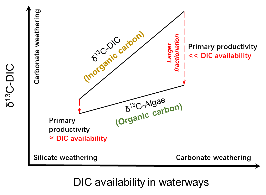 溶解无机碳(DIC)为初级生产者提供碳,随后转移给流水生态系统中的消费者。在全球范围内,大约60%的河流DIC来自土壤呼吸,其余主要来自碳酸盐矿物。碳酸盐岩的化学风化比硅酸盐岩快,并且具有较高的同位素值。因此,以碳酸盐岩为主的流域河流中DIC浓度和δ13C往往较高。因此,岩性应是河流δ13C和DIC浓度的关键驱动因素,进而通过初级生产调节藻类的δ13C特征。尽管研究已经探索了流域(如土地利用、流域面积)或河流(如养分浓度、光线、水流速度、生产力)特征与藻类δ13C的联系,岩性对河流内源碳的产生及其δ13C的控制仍有待研究。