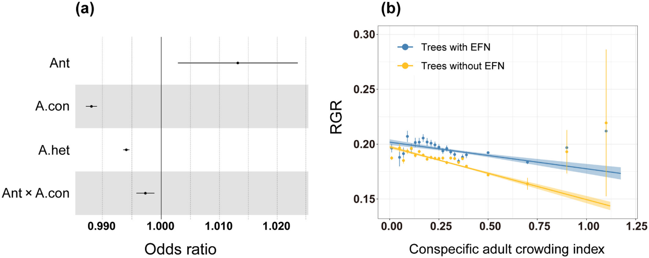 蚂蚁可以与植物形成互利共生系统,在这个系统中,植物为蚂蚁提供食物或者巢穴,蚂蚁则可以帮助植物抵抗植食者的侵害。蚂蚁与植物的互利共生在热带雨林中非常普遍且成功,以至于具有花外蜜腺的植物往往可以成为建群种。传统的生态学理论认为植物的密度制约效应是由植食者直接作用于植物进而影响植物的存活和生长,而蚂蚁与植物之间的互利共生关系是否可以介导群落水平上的密度制约目前尚不清楚。