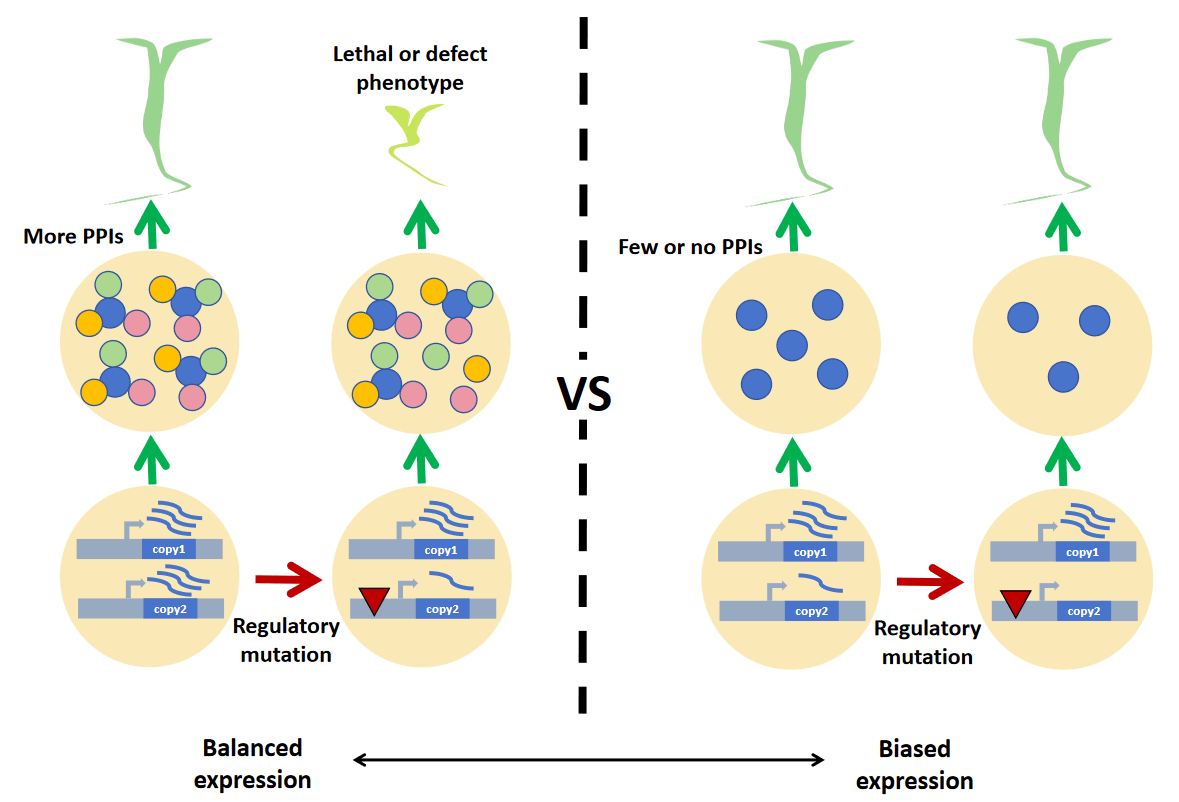 在植物演化中,全基因组加倍或多倍化(WGD)事件普遍且频繁,如模式植物拟南芥自被子植物起源以来就经历了多次。这些WGD事件产生的功能冗余基因重复或复制基因为物种进化提供了遗传材料,有助于物种适应环境和多样化。然而,在长期分化过程中,大量WGD基因重复演化寿命较短,常丢失一个拷贝。幸存的大多WGD基因重复拷贝间表达水平各异,但部分拷贝间保持高度相似(平衡)的表达。基因剂量平衡假设认为,为维持蛋白质复合体亚基或互作蛋白质的化学计量比,选择压力作用于基因间相对拷贝数。这解释了为何编码这些蛋白质的基因在WGD后能长期存留,拥有较长演化寿命。然而,最终决定化学计量比的是基因表达产物的量。因此,自然产生一个问题:基因剂量平衡的选择压力是否也作用于或约束着基因重复两拷贝间表达水平的分化(图1)?