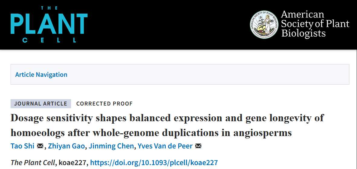 研究成果以“Dosage sensitivity shapes balanced expression and gene longevity of homoeologs after whole-genome duplications in angiosperms”为题发表在国际期刊The Plant Cell上。武汉植物园水生植物生物地理学科石涛研究员为共同第一和共同通讯作者、高志妍助理研究员为共同第一作者,比利时根特大学Yves Van de Peer教授为共同通讯作者。武汉植物园陈进明研究员参与该工作。该研究得到了国家自然科学基金面上项目(32170240)和湖北省自然科学基金青年项目(2024AFB314)的资助。