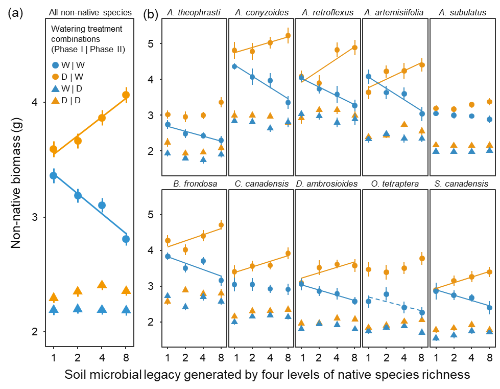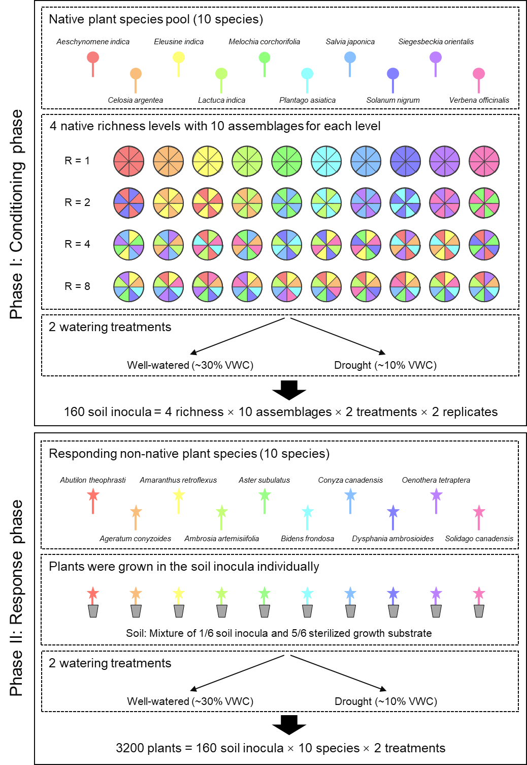 本研究选取了10种入侵植物和10种本地植物,开展了一项两阶段的植物-土壤反馈实验,并在土壤培育(前期水分处理)和反馈阶段(后期水分处理)分别进行了水分调控。研究表明:在前期非水分胁迫条件下,多样性较高的群落产生的土壤微生物抑制入侵植物的生长;但在前期水分胁迫条件下,多样性较高的群落产生的土壤微生物则促进入侵植物的生长。这可能是由于本地植物多样性通过调节从枝菌根真菌(AMF)多样性所介导的。此外,在后期水分胁迫下,不同植物多样性所产生的土壤微生物与入侵植物的生长表现无显著相关性。