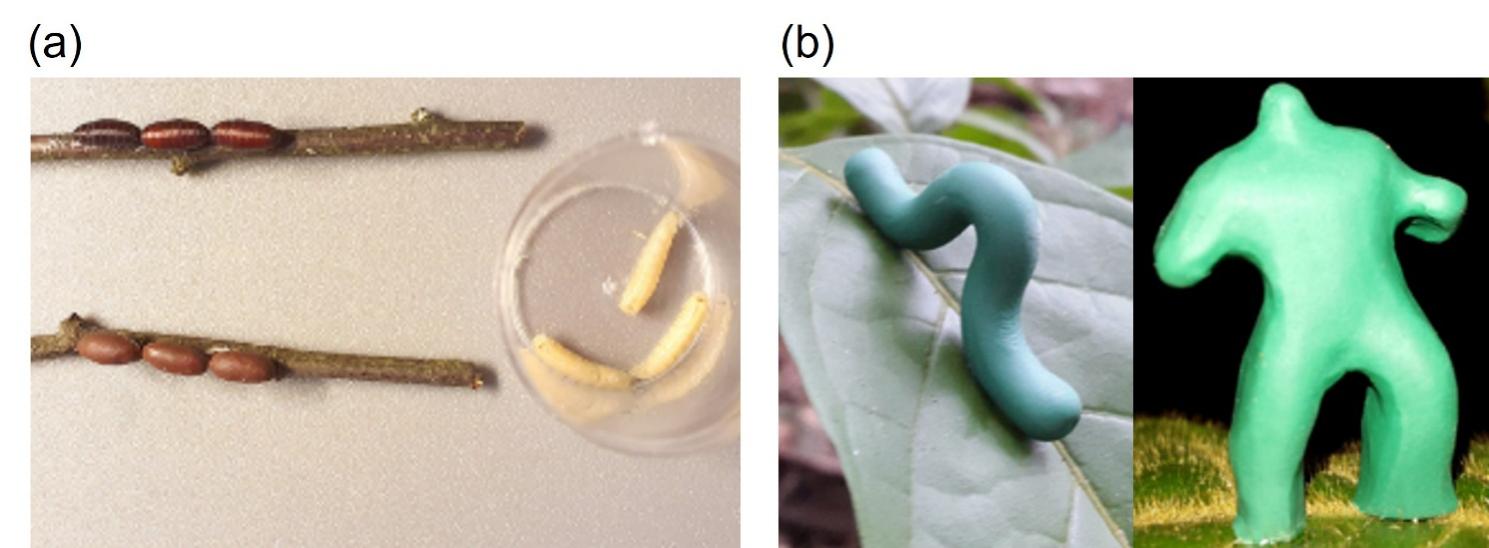 a. Zvereva等(2022)发现橡皮泥模型(左下)上动物痕迹的类别和时间格局与真实的蛆虫(右)和虫蛹(左上)存在较大差异。b. Weissflog等(2022)发现绿色毛虫模型和绿巨人模型被动物攻击的概率没有差别。