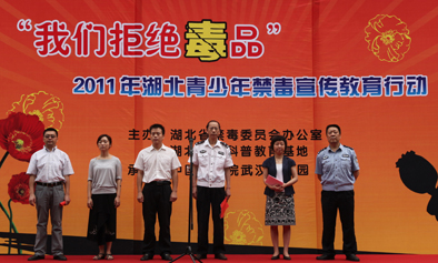 6月25日上午10时,“我们拒绝毒品”2011年湖北省青少年禁毒宣传教育行动启动仪式在武汉植物园举行。省公安厅禁毒总队副总队长方星明、省公安厅禁毒总队预防教育中心主任王代松、武汉植物园党委副书记龚俊杰和武汉植物园园艺中心主任、总园艺师刘宏涛等领导出席启动仪式。湖北大学、湖北工业大学等高校600余名学生参加当天禁毒宣传教育行动。