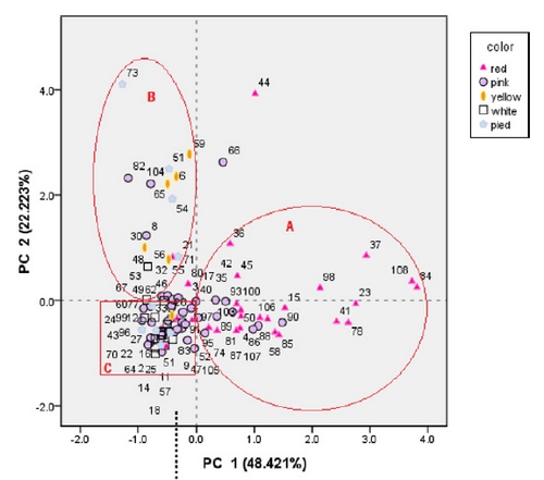 研究发现,在108个品种中共检测到5种花青素14种黄酮及黄酮醇。其中,白色和杂色品种中几乎不含花青素;红色品种比粉红色的花青素含量高。二甲花翠素-3-O-葡萄糖苷是五种花青素中含量最高的一种花青素,这表明花青素含量越高,红色程度越深,而二甲花翠素对红色的贡献最大。黄酮和黄酮醇是辅助色素。主成分分析(PCA)选择两个主成分:PC1由花青素含量决定,PC2与黄酮及黄酮醇含量相关。结果发现该法可将大部分品种划分为3组:A、B、C。A组的花青素含量较高,包括大部分的红色品种及少量的粉红色品种,B组含有较高的黄酮及黄酮醇,包括大部分的黄色品种,较多的杂色品种及少量其它颜色品种,而C组这两种类黄酮的含量都较少,主要由大部分的粉红色、白色和杂色品种组成,这也说明了红色与花青素含量密切相关,而黄色与黄酮及黄酮醇的含量相关。该研究结果为莲资源的综合利用提供了基础数据。