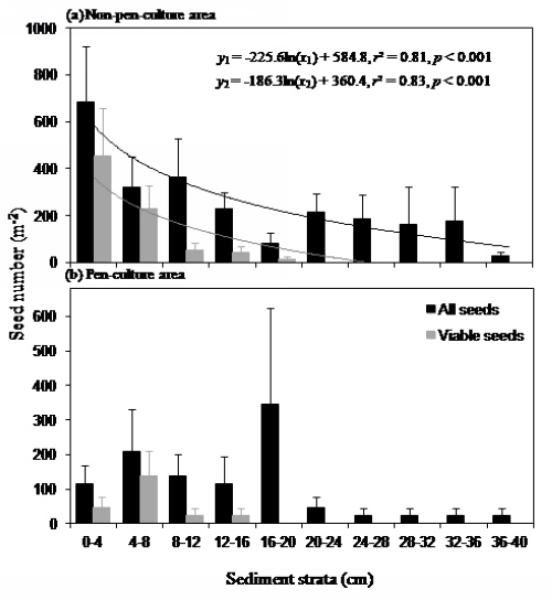 武汉植物园湿地生态学科组肖蒇博士在刘贵华研究员指导下,通过对洪湖敞水区40cm深度的底泥种子库进行取样分析,结合两次植被调查数据以及3个时期的历史植被资料,发现湖泊种子库垂直分布格局在一定程度上可以反映出植被的演变历史过程。此外,在比较了三种不同利用类型的湖区底泥种子库结构后发现,无论是物种数目、种子总密度还是有活性的种子密度,非围网养殖区(non-pen-culture area)都显著高于围网养殖区(pen-culture area)。同时,在弃围区(abandoned pen-culture area),种子库对地表植被恢复的贡献潜力依然巨大