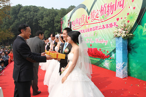 新郎种红掌,新娘来浇灌,一场体现植物特色的集体婚礼也在中心草坪精彩上演。来自武汉植物园的6对职工新人通过种植红掌的方式来寄托日子红红火火一番风顺的寓意,特色十足。在蓝天碧草间,6对新人放飞彩色气球,撒下沾满喜气的糖果。