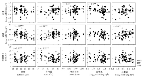 普通野生稻北部同质园种群(NEP)、自然种群(NP)和南部同质园种群(SEP)叶片N、P及N:P比与纬度、年均温(AMT)、年均降水量(AMP)、土壤速效N和P之间的关系