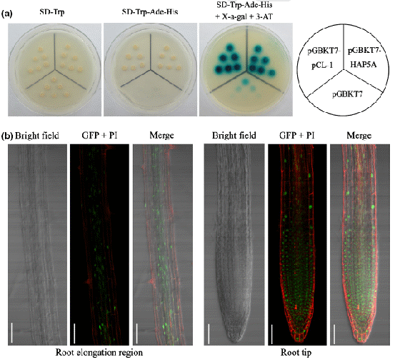 AtHAP5A在酵母细胞中具有转录激活活性(a)并定位于细胞核(b)