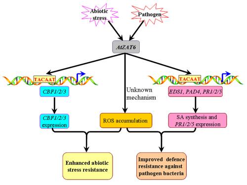 中国科学院武汉植物园植物水分胁迫生物学学科组施海涛博士在产祝龙研究员的指导下,分离鉴定了一个受生物胁迫(细菌侵染)和非生物胁迫(包括干旱、盐和冷害)大量诱导的拟南芥锌指结构转录因子ZAT6。进一步通过获得ZAT6过表达植株和抑制表达植株,发现ZAT6可以正调控植物对生物胁迫(细菌侵染)和非生物胁迫(包括干旱、盐和冷害)的抗性。生理学分析表明ZAT6正调控正常情况下和病原菌侵染过程中的活性氧含量,从而使ZAT6过表达植株表现为组成性激活的抗病反应。利用染色质免疫共沉淀(ChIP)-PCR技术,发现ZAT6可以直接结合水杨酸信号相关基因和CBF1-3启动子区的TACAAT元件并正调控这些基因的表达。以上研究揭示了多种逆境胁迫下锌指蛋白ZAT6的分子调控网络,相关的研究结果能够直接应用于生产实际,为提高相关农作物的抗性,减少经济损失提供理论基础和实际操作的可行性。