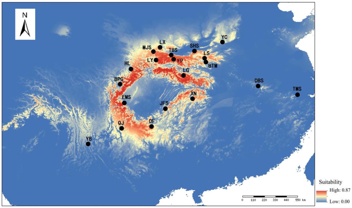 图1. 在中国分布区内,领春木采样点(“●”)位置和分布区物种适合度(红色区域表示最适宜分布区)