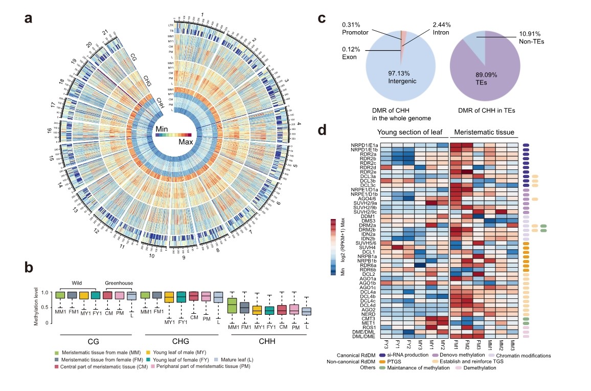 通过对百岁兰原始分生组织和新老叶段的甲基化测序和比较,发现百岁兰基因组整体呈现极端重度甲基化,并通过CHH位点甲基化动态差异来特异性调节沉默转座子,以维持分生组织细胞基因组完整性,避免DNA的有害突变。有意思的是,重度的甲基化似乎加速了百岁兰基因组脱氨基的速率,使得其G-C含量异常低。在漫长的极端干旱和贫营养的条件下,百岁兰基因组演化朝着小且‘低能耗’的方向演化。
