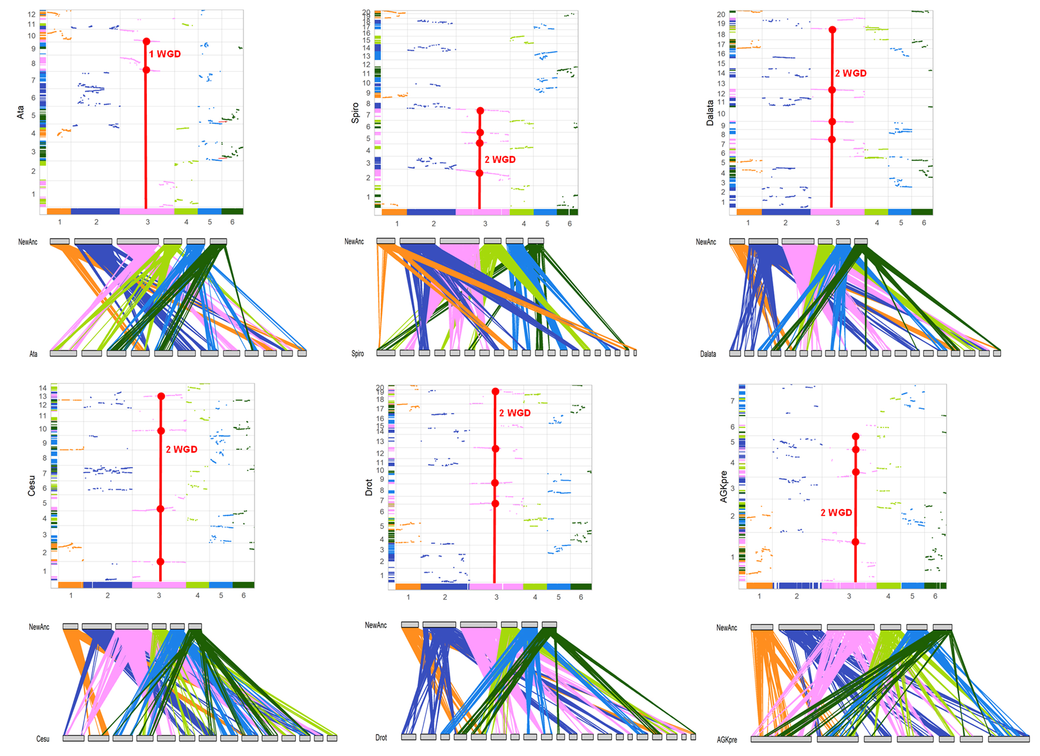 单子叶植物在形态特征上(如根、叶脉等)明显区别于其它开花植物,其祖先的早期起源是植物演化生物学关注热点问题之一,最早的单子叶植物化石记录可以追溯到白垩纪早期。除基部单子叶植物(菖蒲目、泽泻目、水鳖目等)大多为水生、湿生植物等原因外,早期水生单子叶植物化石记录(例如泽泻目等)至少出现在上白垩纪,有学者因此提出单子叶植物祖先起源于水生环境,叶植物祖先水生起源的推测仍需更多的古生物学和基因组演化的证据支持。而对已测序的单子叶植物物种基因组中基因或同源片段的线性排序变化比较分析,将有助于了解驱动单子叶植物演化轨迹的关键影响因素。在单子叶植物辐射分化过程中,全基因组重复或多倍化WGD现象十分普遍,该现象认为是推动物种多样化和适应环境的关键机制之一,古多倍化和衍生基因组重排如何推动单子叶植物多样化这一问题亟待解决