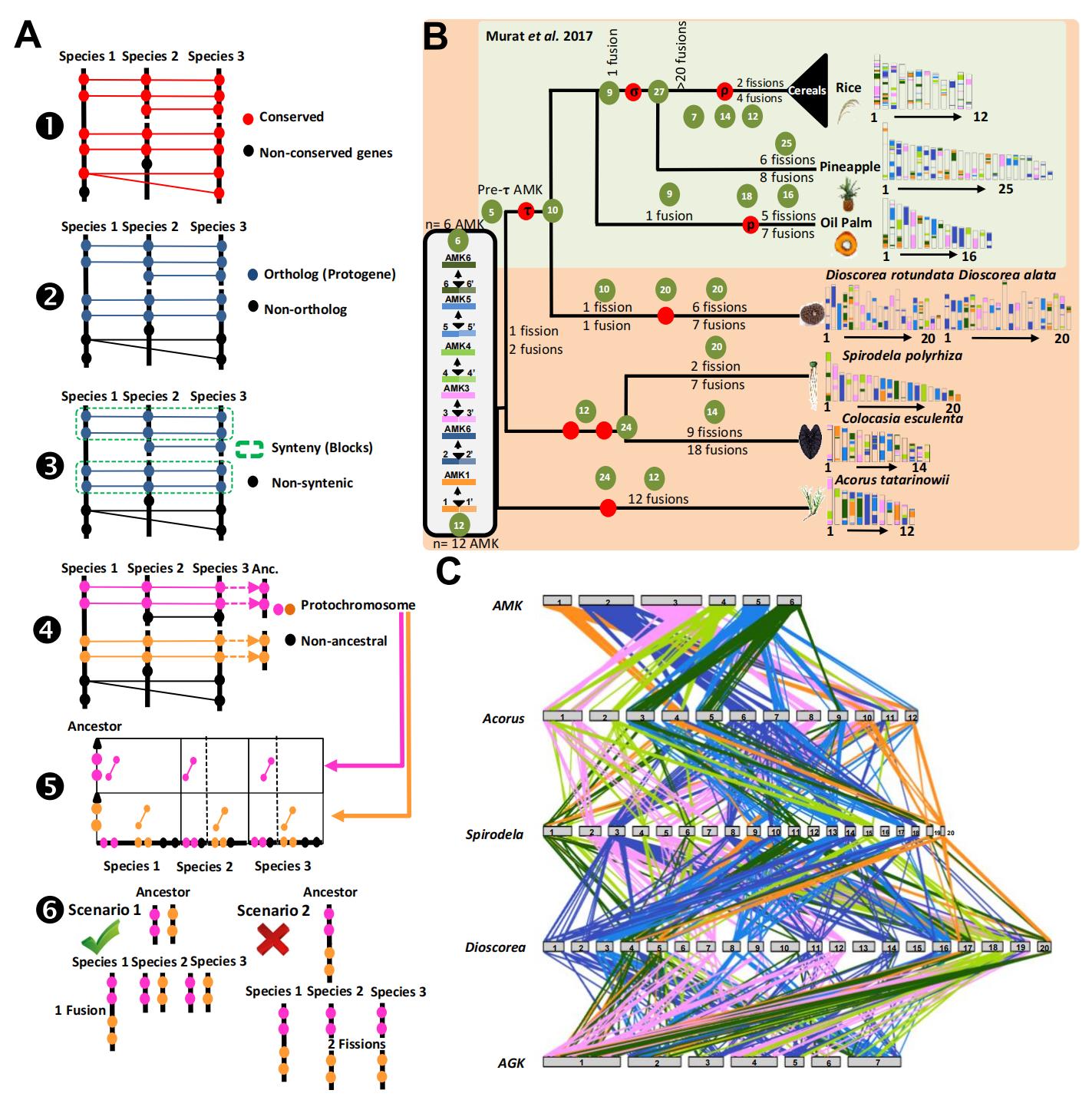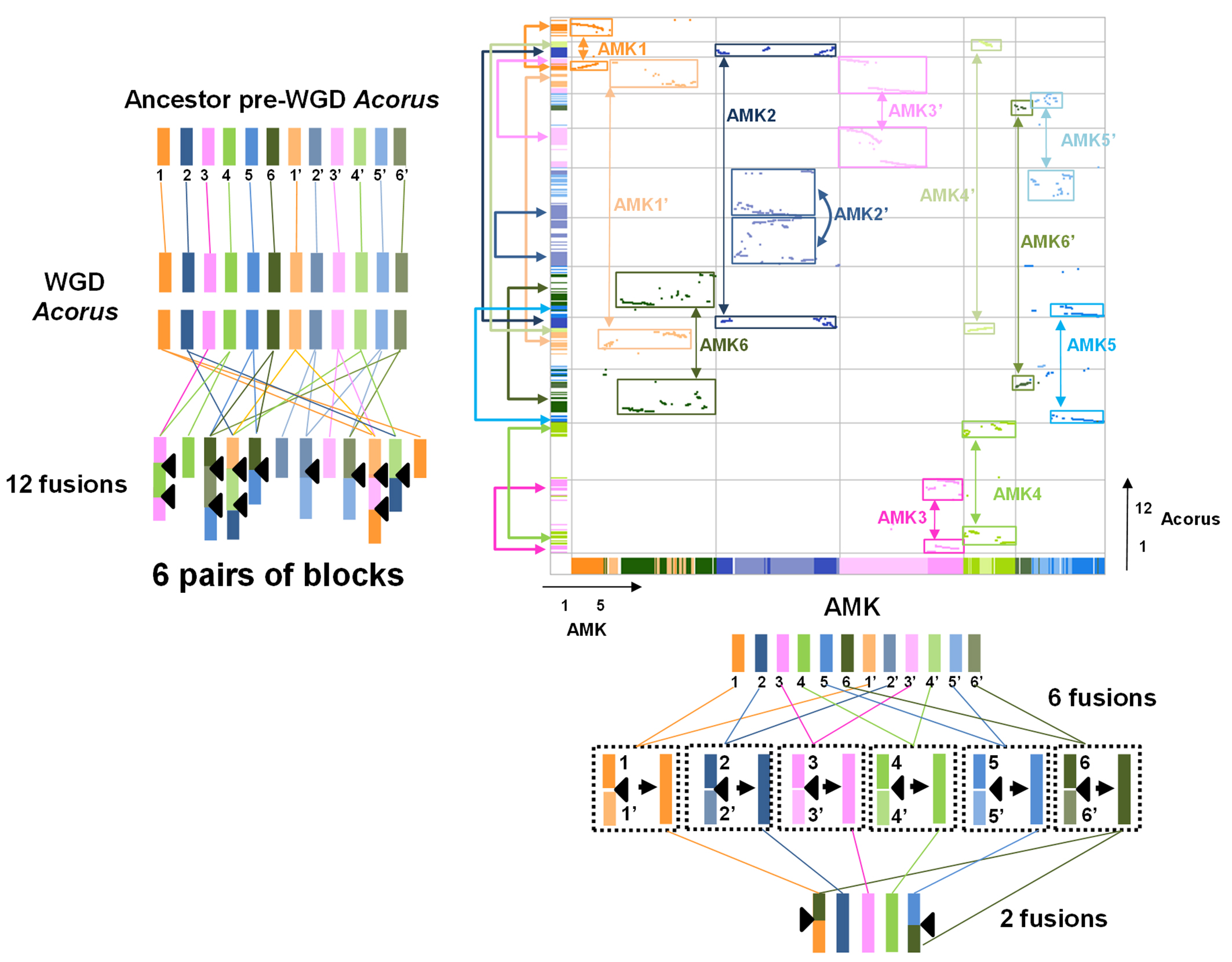 该项研究基于石菖蒲和其它单子叶植物早期分支物种,将之前构建的pre-τ时期的单子叶植物祖先核型(pre-τ AMK2n = 10)(Murat et al., 2017, Nature Genetics, doi:10.1038/ng.3813)更新到了单子叶植物最早期祖先的12条染色体(AMK2n = 12)(图2)。基于该祖先核型,重演了单子叶植物早期的核型演化过程:石菖蒲的核型是由单子叶植物祖先AMK n = 6)通过其特有的基因组加倍形成 n = 12 染色体中间体,然后进行12次染色体融合而形成其目前的12条现代染色体(图3)。研究还发现,与石菖蒲等早期分支的类群相比,禾本科植物(如水稻)历史上经历过更多次的融合、分裂等染色体重排事件。