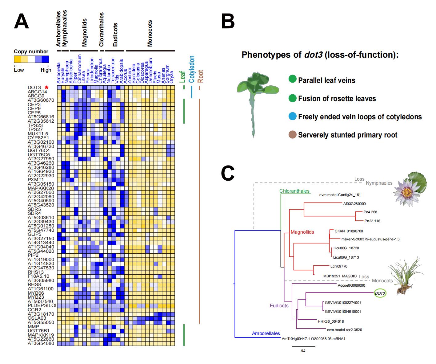 在基因家族演化方面,该项研究揭示了与单子叶植物早期形态演化和适应湿地或水生生境(如平行叶脉和初生根的退化、低水平的无机磷酸盐的水生环境)相关的重要功能基因家族演化事件。例如在拟南芥中DOT3DEFECTIVELY ORGANIZED TRIBUTARIES 3基因已被证实其功能缺失会导致幼苗和初生根生长方面存在缺陷,并在幼叶中产生异常的平行脉纹,DOT3在单子叶植物和水生睡莲目植物(睡莲、芡实)中都发生了丢失,可能与这两个类群的平行/掌状叶脉和初生根(主根)退化等特殊性状相关(图4)。