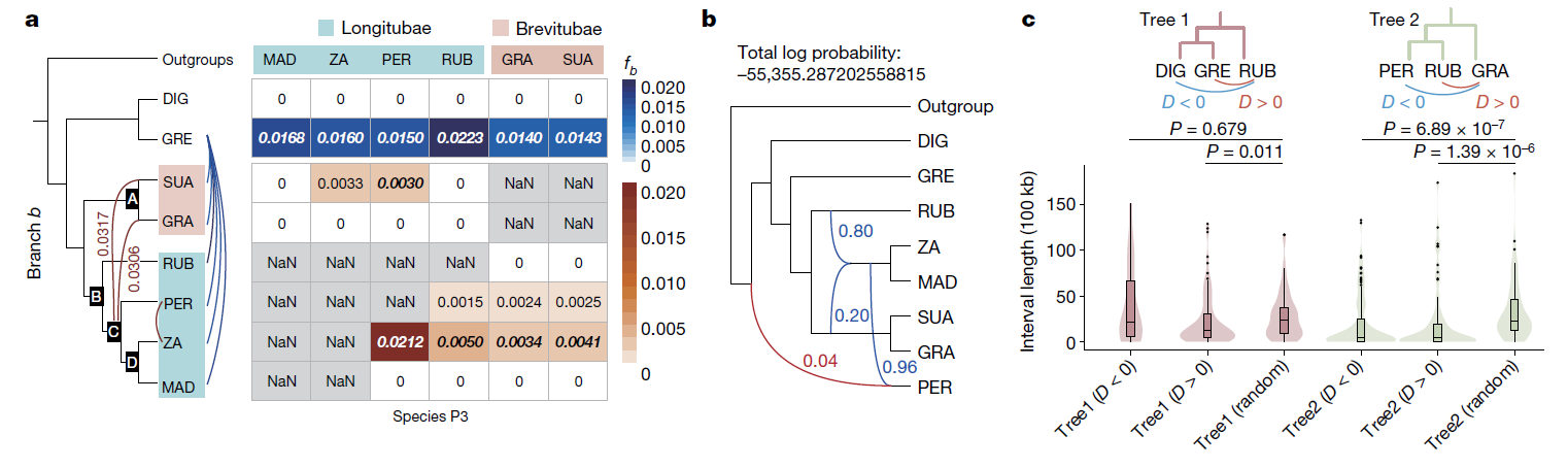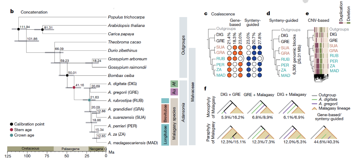 研究人员通过对来自马达加斯加、塞内加尔和澳大利亚的8个猴面包树物种野生个体遗传信息解析,重建了猴面包树属演化历史,发现其物种多样性分化始于距今约2100万年前,该时间远晚于非洲和澳大利亚板块的分离及马达加斯加岛的形成(约1.6亿年前)。不仅如此,综合数据分析表明包括已形成洲际隔离或岛屿同域分布的猴面包树物种,在历史上均存在种间杂交情况,从而导致了属内全基因组水平上系统发育关系信号的不一致性(图3),依据研究揭示的历史同域杂交式样和实际的跨洋扩散可能性,提出马达加斯加岛应为现存猴面包树属冠群的起源分化中心。