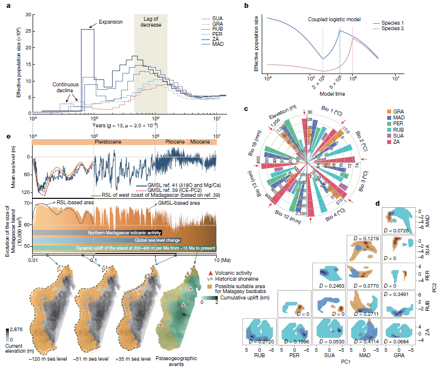 2024年5月15日,由中国科学院武汉植物园/中国科学院中-非联合研究中心(以下简称“中-非中心”)牵头,联合英国伦敦玛丽女王大学、英国皇家植物园邱园、华大基因、马达加斯加塔那那利佛大学、肯尼亚国家博物馆、上海辰山植物园等科研机构,在《自然》杂志(Nature)发表了题为“The rise of baobab trees in Madagascar”的研究论文,系统阐明了全球关注的濒危植物类群——猴面包树属的多样性演化历史,提出马达加斯加应为该属的起源分化中心,研究通过综合遗传、生态、地理数据分析,重点揭示了马达加斯加猴面包树历史种群动态变化的驱动因素,并就其未来保护提出科学、有效的保护策略及建议。