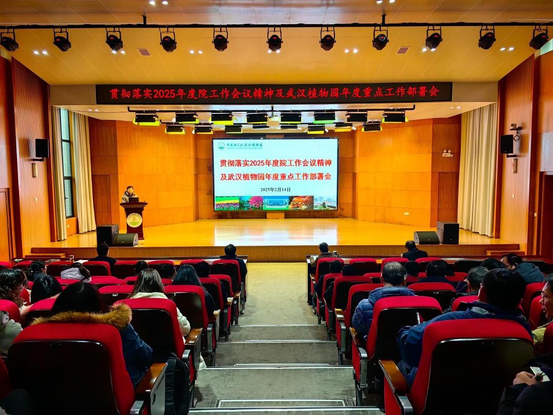 2025年2月14日,武汉植物园召开贯彻落实2025年度院工作会议精神及武汉植物园年度重点工作部署会。园领导班子成员,党委委员、纪委委员,党支部书记,研究中心负责人,中层干部,科研及管理骨干代表、学生代表等150余人参加会议。会议由副主任刘宏涛主持。