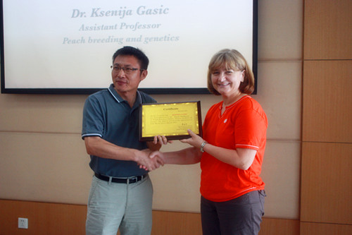 5月21号上午,应中国科学院植物种质创新与特色农业院重点实验室韩月彭研究员的邀请,美国克莱姆森大学Ksenija Gasic博士到武汉植物园进行学术交流,并做了题名为“Peach breeding program at clemson university”的学术讲座。