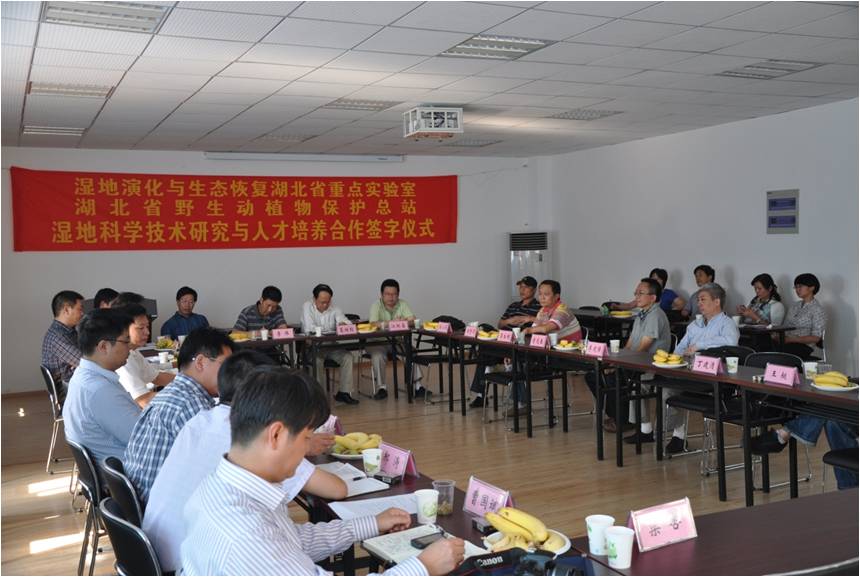 随后举行了签字仪式,湿地演化与生态恢复湖北省重点实验室主任李伟研究员和湖北省野生动植物保护总站站长侯开举教授级高级工程师代表双方在合作协议上签字。并就今后的具体合作进行了深入地探讨。