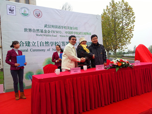 11月13日,中科院武汉植物园联合世界自然基金会(WWF)、武汉外国语学校美加分校联合建立“自然学校”签署合作书及揭牌仪式在美加分校湖湾生态湿地科普基地举行,武汉植物园主任助理、园艺中心主任刘宏涛出席仪式。