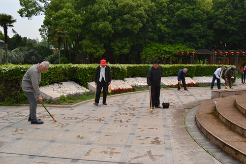 中华地书”是我国书法的一个分支,是近年来兴起的一项群众文化活动,地书爱好者们手持特制的大“笔”,以地为纸,以水为墨,是对传统书法艺术的一种拓展。磨山社区组织本次活动,是为了迎接即将在武汉举行的“武汉地书协会年会”和“2014书写大武汉”活动的开展,同时也是展示社区精神文明建设和文化建设的一个重要方面。