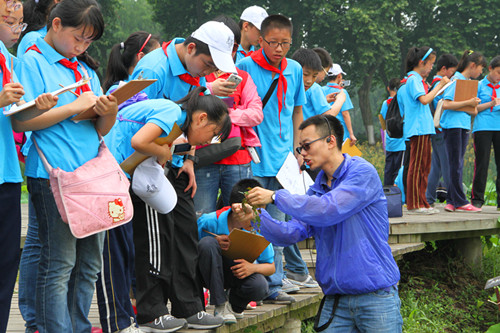 活动现场还摆放着内容丰富的科普知识宣传板和科普小发明,科普展板图文并茂、简洁生动地介绍了种群植物、生物入侵和植物杀手的有关知识,吸引了很多小朋友驻足观看。“手摇发电”“穿墙而过”“人造龙卷风”“看谁跑得快”等科普小发明让小朋友们兴趣盎然,纷纷动手体验。仪式结束后,武汉植物园楚海家博士、代文魁博士还带领学生们进行了以水生植物、入侵植物和景观温室植物为主题的科普课堂。
