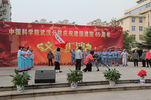 秋高气爽,丹桂飘香,正值全国人民喜迎中华人民共和国诞生65周年的时刻,9月26日,中国科学院武汉分院大楼前广场上彩旗飘扬,歌声回荡,洋溢着一派欢乐的节日景象。武汉分院所属单位的职工、离退休老同志、研究生们欢聚一堂,隆重举行庆祝建国建院65周年文艺汇演。
