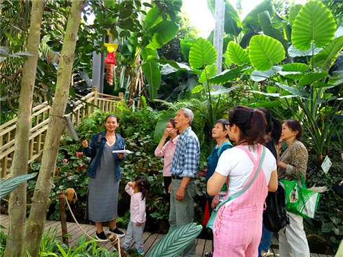 “各位到武汉植物园参观的游客,我们免费讲解现在出发了。”15时,在景观温室大门口,讲解员袁俊青带着7名游客,穿过熙熙攘攘的人群,走进景观温室的热带雨林区。