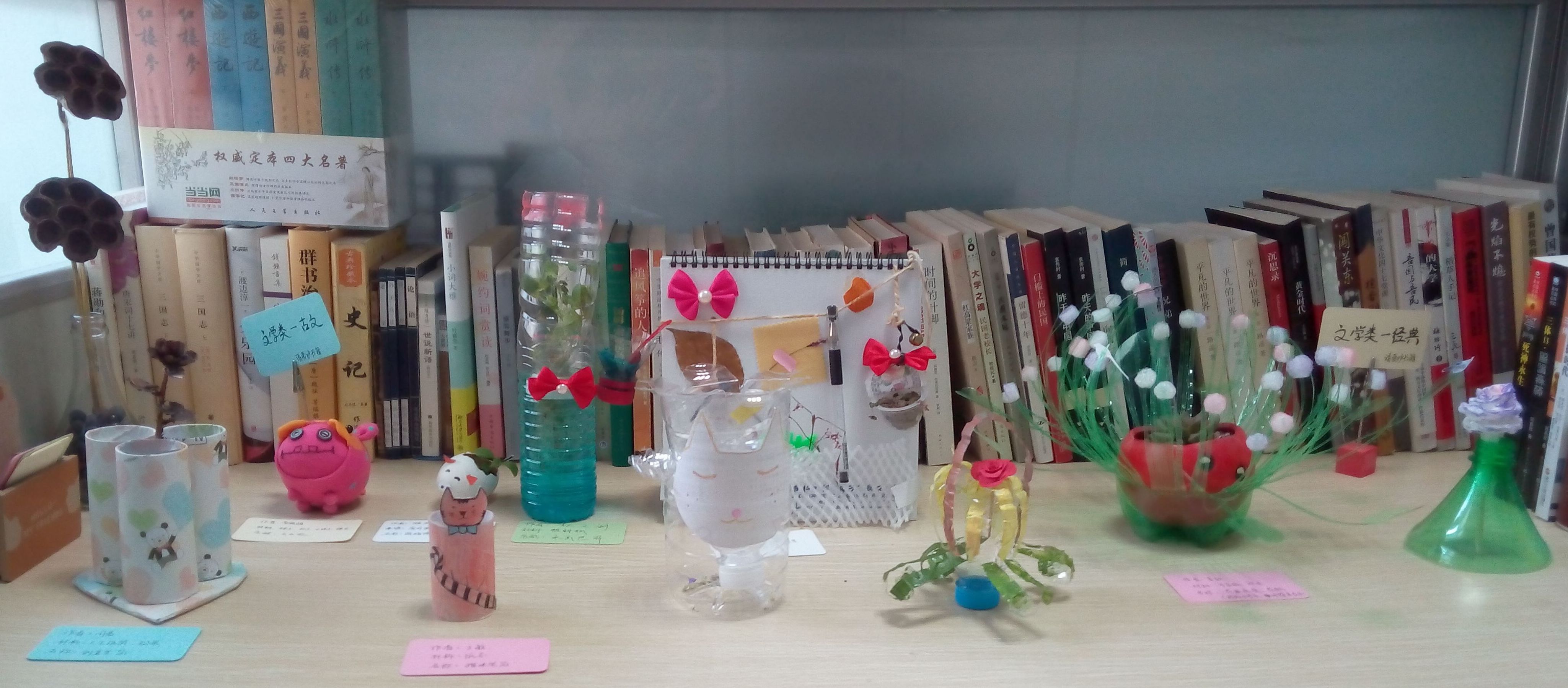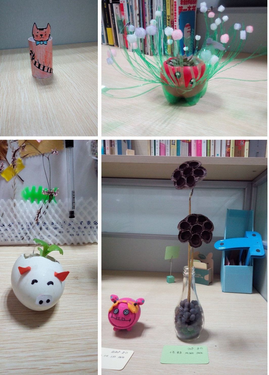 活动得到大家的积极参与,共收到精美作品十余份。同学们想法奇特,创意奇妙。活动最积极的巧手顾同学把小小鸡蛋壳打扮成了一个萌萌小盆栽,可爱中又不失实用价值,放在书桌旁看着就喜爱的不得了;心灵手巧的李师姐用自己的旧袜子做成可爱的小猪玩偶,两枚旧衣服上的扣子变成了小猪炯炯有神的小眼睛,萌化了大家的心;荷花课题组的李同学利用自己组内实验废弃的莲蓬与莲子再搭配一个丢弃的玻璃瓶,瞬间变成了高雅的艺术品,让人赞不绝口!美女兼才女的姜同学,利用一个大饮料瓶做成一个漂亮的花盆托,她说,有了这个花盆托,自己养的小盆栽再也不怕浇水后漏水了。还有周师姐松球果做成的玫瑰花,李同学塑料瓶彩绘成的小花篮等都受到了大家的一致好评。全部DIY作品均陈列在板房研究生办公室图书角集中展示,得到老师们和同学们的高度赞赏。