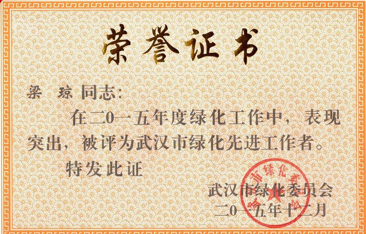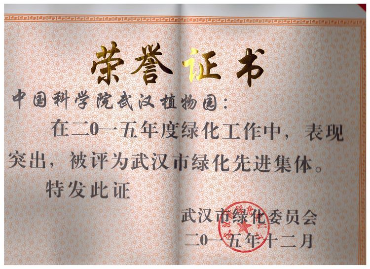 12月14日,从武汉市绿化委员会传来捷报,武汉植物园获得“武汉市先进集体”荣誉称号,园主任助理、园艺中心主任梁琼同志获得“武汉市绿化先进工作者”荣誉称号。