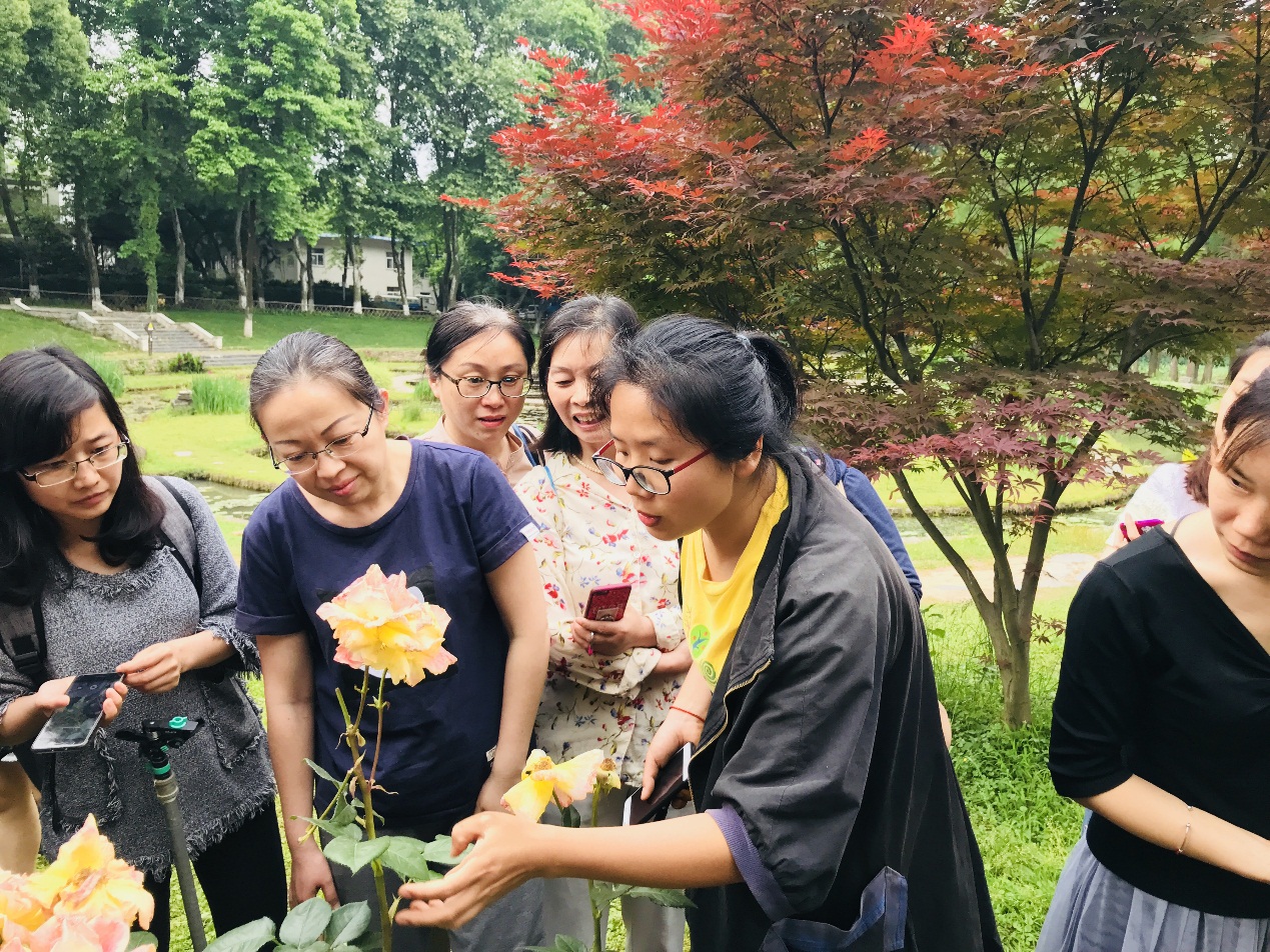 谢娟为科普讲解志愿者讲授月季知识