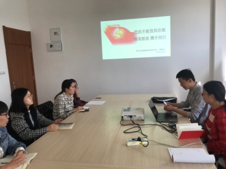 温小斌首先明确了本次会议的流程和主题--“党员不能信仰宗教”、“精准脱贫携手同行”。纪检委员张玲玲带领大家学习《中国共产党纪律处分条例》相关重点内容,结合科研支部提出了18条高压线是作为党员不能去碰触的,其中重点强调了党员不能信仰宗教。宣传委员范民霞带领大家学习习近平总书记关于精准扶贫的重要指示精神及中央、省委关于精准扶贫相关政策和精神。依据33条重要指示精神要求科研人员能够结合自身所学,为精准脱贫贡献出自身力量。根据10月26日支委会的安排,温小斌结合本次主题进行了中心发言。