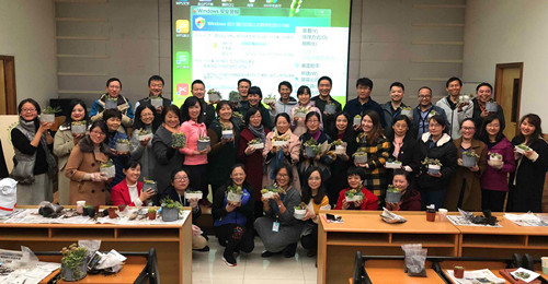 讲座后,两个支部开展了多肉植物微景观制作活动。在园艺师龚雪琴和万舒璇的指导下,大家充分发挥想象力,将土壤、多肉植物,加上各种砂石、可爱的卡通人物等装进器皿里,一个个精巧的微景观渐渐成型,构成一个个妙趣横生的小世界,借此培养大家热爱园艺、热爱生活的情感。