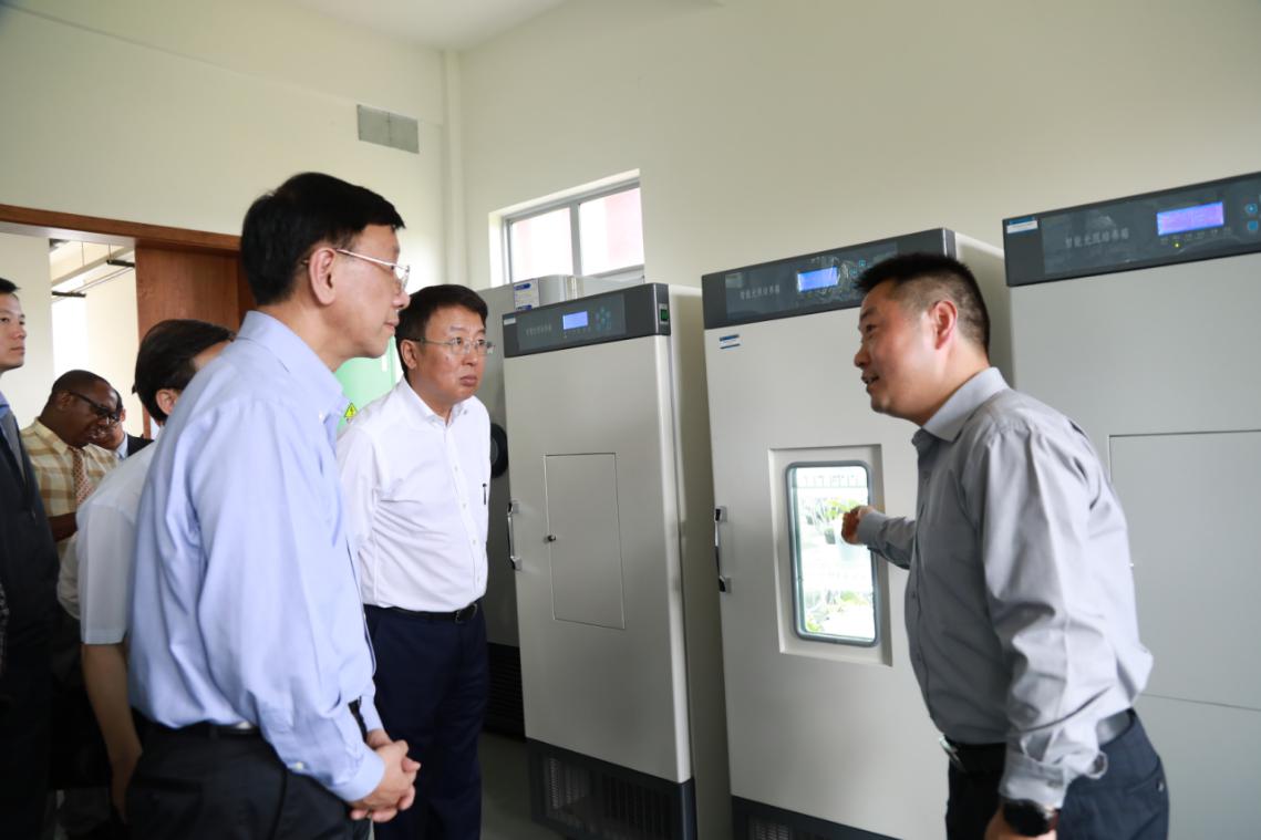 在中-非中心实验楼,曹建明参观了中-非中心成立以来中非双方科学家取得的研究成果,包括联合出版的学术专著及非洲植物试制产品;在中-非中心生物多样性保护、分子与细胞、遥感与灾害预警等专业实验室听取了中-非中心执行主任严雪关于肯尼亚传统蔬菜植保及“肯尼亚水塔计划”等合作项目的介绍,并与正在开展研究工作的中非科研人员进行亲切交谈。