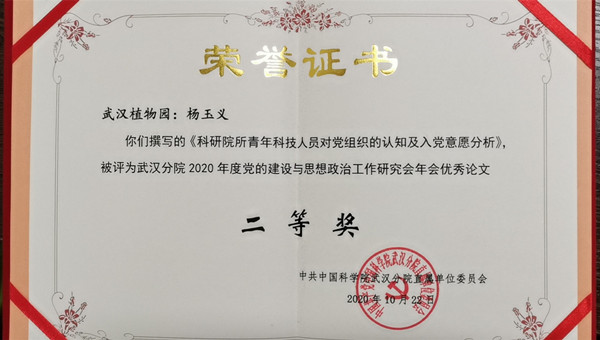 10月22日,武汉分院召开2020年党建政研会年会。会上,武汉植物园水生植物科研党支部书记杨玉义研究员撰写的论文《科研院所青年科技人员对党组织的认知及入党意愿探究——基于中国科学院武汉植物园的调研分析》获得二等奖,并做大会交流。