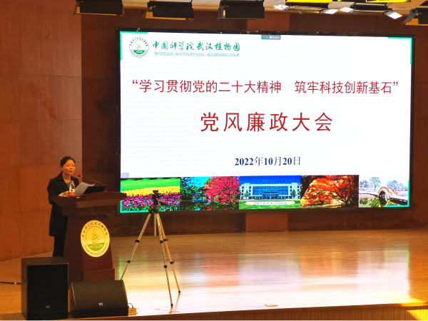 10月20日上午,武汉植物园召开“学习贯彻党的二十大精神 筑牢科技创新基石”党风廉政大会。会议由纪委书记徐红革主持,园领导、科研诚信管理有关部门负责人、科研人员和研究生参会。