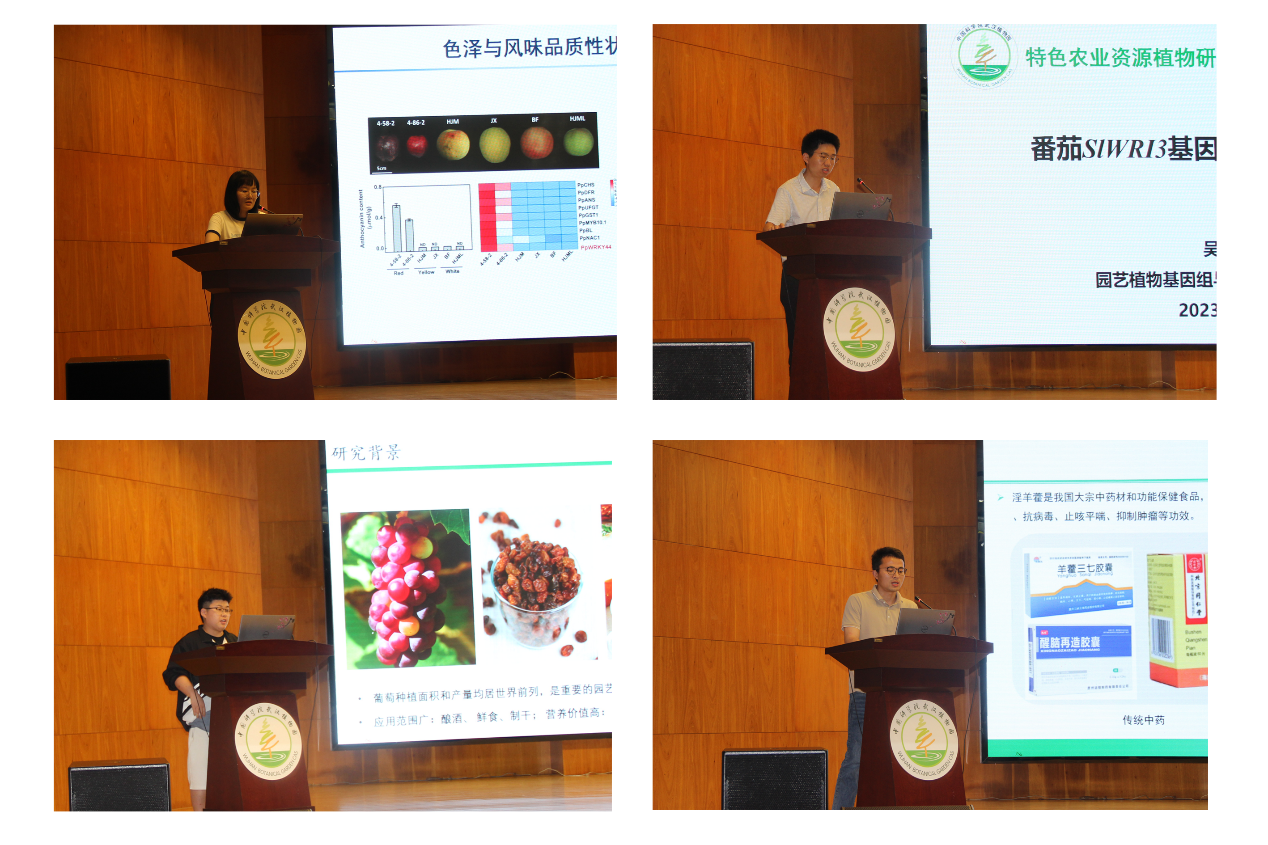 来自中心10个学科组的青年研究人员分别就桃果实着色和酸化分子机制、桃近核红形成分子机理、细胞壁在植物生长发育和叶片衰老中的作用机制、猕猴桃质体基因工程、毛花猕猴桃局部适应性分子机制、箭叶淫羊藿糖基转移酶基因挖掘与功能分析、番茄SlWRI3基因功能研究、浙江猕猴桃进化起源、山葡萄应答干旱的分子机理、植物短链脂肪酸的抗癌机制、酰基辅酶A质谱鉴定方法等作了学术报告。与会专家对上述报告一一作了点评,评选出一、二、三等奖,并现场与青年研究人员分享了科研经验和心得体会。
