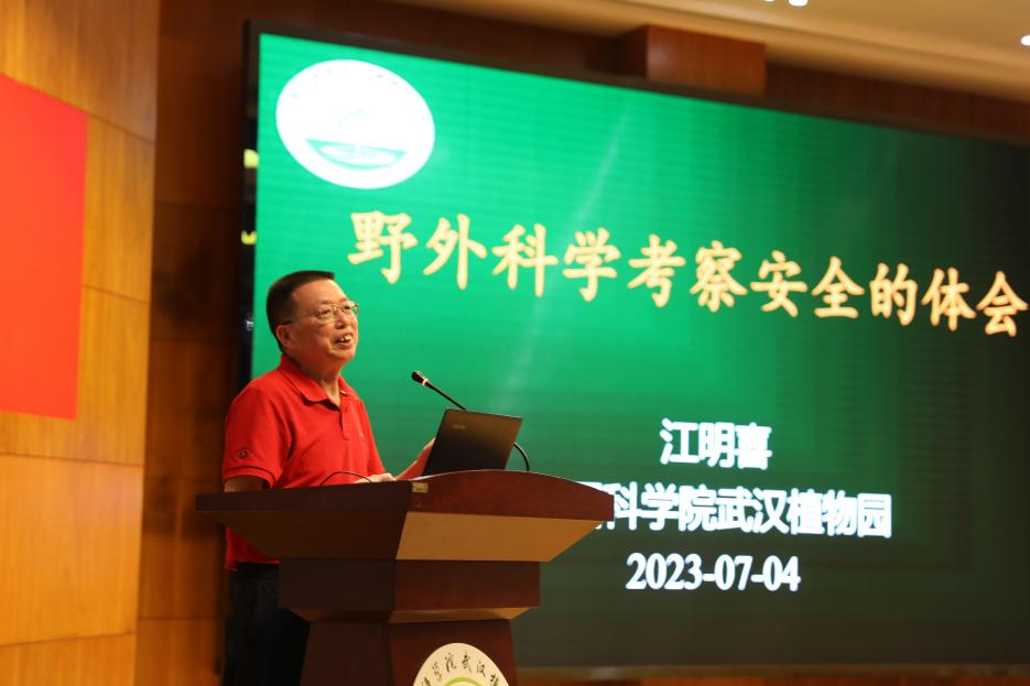 会上,武汉植物园江明喜研究员以《野外科考安全工作的体会》为主题,用自己三十余年的野外科考工作经历为大家讲述了他在野外科考工作中的见闻与体会,他强调“无安全,不科考”,安全工作是野外科考工作开展的首要环节,并从环境教育和行前准备两个方面展开,为大家上了一堂生动的野外科考安全教育课程,进一步提升了师生的野外安全意识。